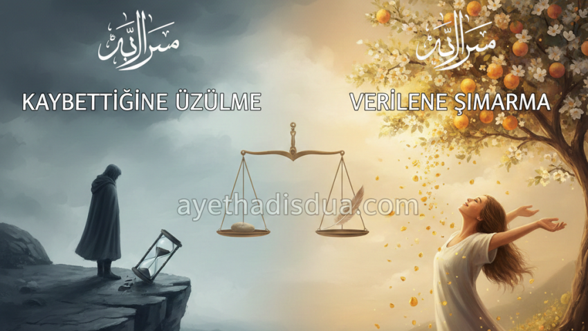 Bu ayetler aynı zamanda psikolojik bir denge öğretisidir. Sürekli geçmişe takılıp kayıplar üzerinde yanmak da, elde edilen nimetlerle taşkınlık yapmak da insana zarar verir. İlahi ölçü ise itidal üzeredir: Sabır ve şükür arasında dengeli bir duruş.