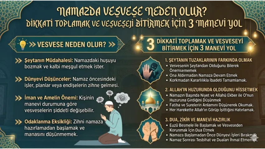 • Vesvese, niyetin sahih olmasını ve kalbin ibadete odaklanmasını engeller. Dikkat dağıtıcı düşüncelerden uzak durmak gerekir.
