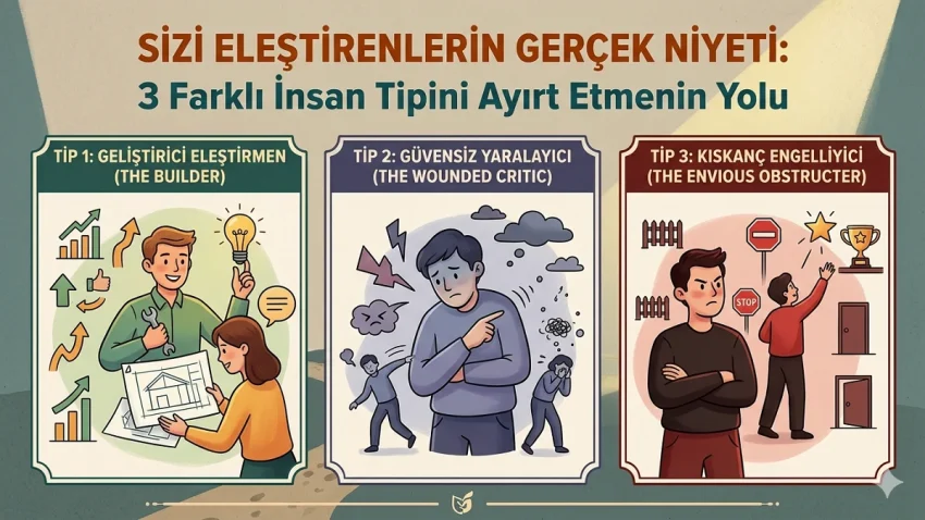 Günün her anında, sosyal medyada ya da ikili ilişkilerde bir eleştiri yağmuruna tutulabiliyoruz. Bazen bir dostun acı sözü içimizi yakıyor, bazen bir yabancının haksız saldırısı uykularımızı kaçırıyor. Ancak hayatın içinde bizi yerenlerin niyeti her zaman aynı değildir. İşte sizi eleştirenlerin gerçek niyetini deşifre eden ve ruhsal dayanıklılığınızı artıracak o üç temel profil.